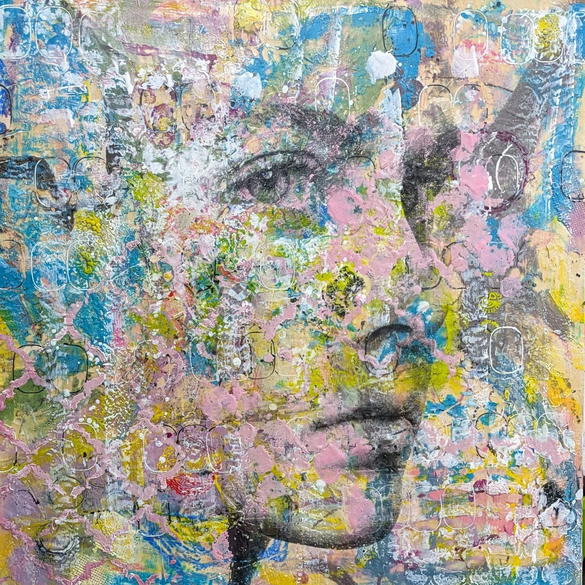 My series of four encaustic collage paintings blends pigment, oils, and collage elements on cradled birch panels. Using fire to fuse layers, she creates rich textures and vibrant colors that tell personal stories. These abstract works explore themes of love, isolation, and emotion, inviting viewers to discover new details over time..